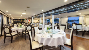 Sau khi nhận phòng xong Qúy Khách quay trở lại Nhà Hàng của Du Thuyền dùng bữa trưa, Và từ đây, cũng chính là lúc Tàu dời bến đưa Du Khách len lỏi giữa những rừng Hang Động và Đảo Đá ở Vịnh Hạ Long. Còn điều gì tuyệt vời hơn khi vừa thưởng thức bữa ăn cùng với bạn bè, người thân, lại vừa được ngắm nhìn cảnh đẹp tuyệt sắc của Vịnh Hạ Long hiện ra trước mắt.