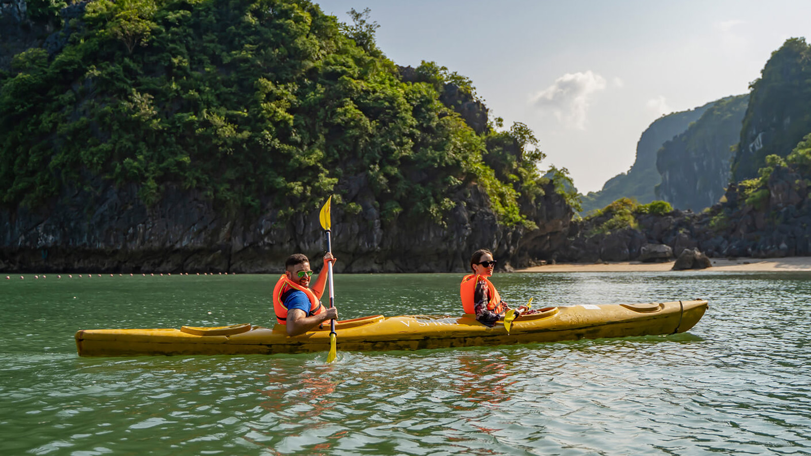 8h00: Quý khách tham gia hoạt động chèo kayaking .Sau đó Quý khách trở lại Du thuyền, trên đường đi quý khách nghỉ ngơi, thư giãn và chiêm ngưỡng vẻ đẹp của hàng ngàn đảo đá, hòa với sự tĩnh lặng và vẻ đẹp của những cánh buồm.