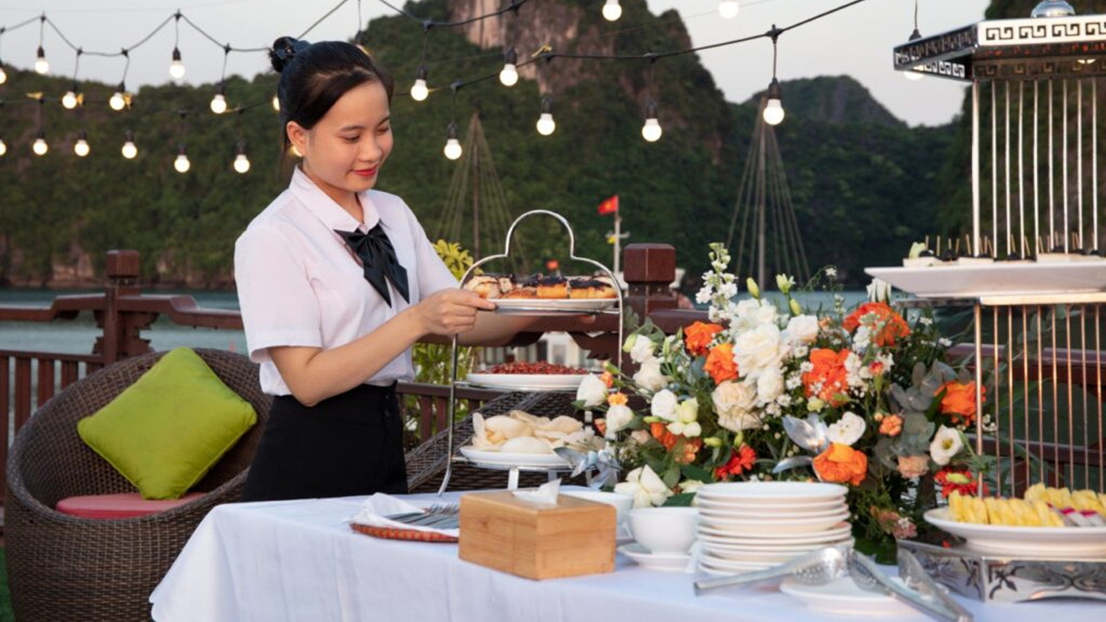 17h00: Quý khách tham gia chương trình Sunset party với hoa quả miễn phí, ngồi trên sân thượng vừa ngắm nhìn Hạ Long trên tàu, vừa thưởng thức một ly cafe để ngắm nhìn hoàng hôn khi chiều xuống.