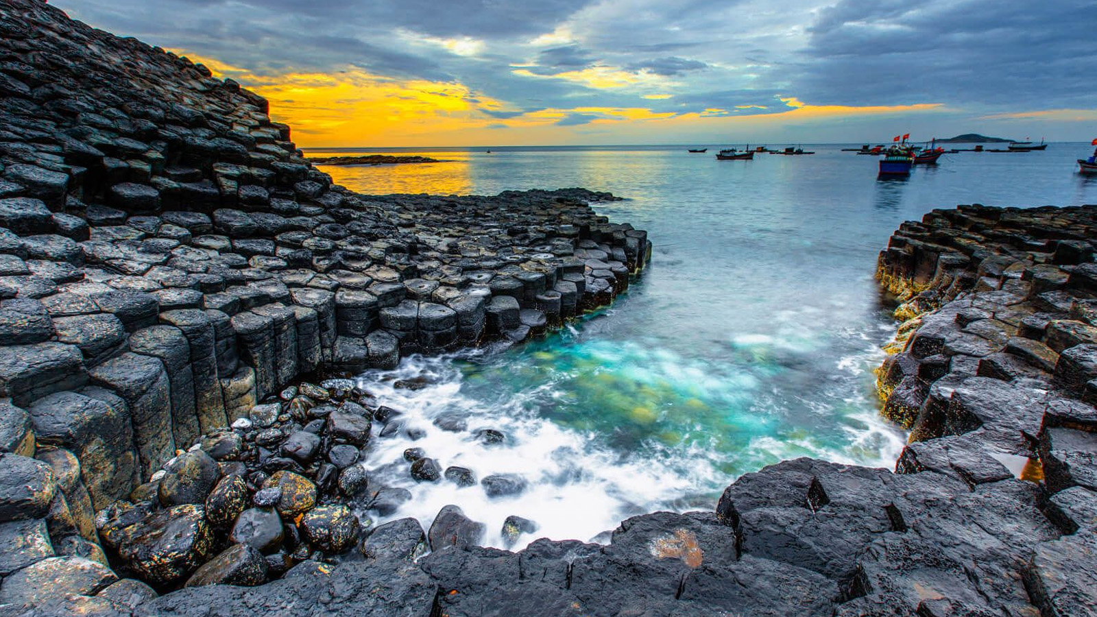 Quý khách tiếp tục di chuyển đến Gành Đá Dĩa, biểu tượng của du lịch Phú Yên. Nơi đây được mệnh danh là tổ ong bằng đá khổng lồ trên biển. Những khối đá hình lục lăng xếp liền kề nhau tạo thành một tuyệt tác vĩ đại của thiên nhiên. Sóng xô vào đá cùng bầu trời xanh ngát tô điểm cho phong cảnh nơi đây thêm hữu tình.